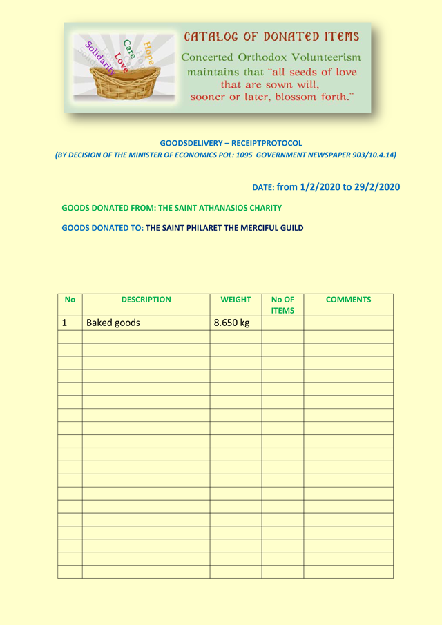 Compilation of the monthly donations to the St. Athanasios Charity from 1.2.2020 to 29.2.2020