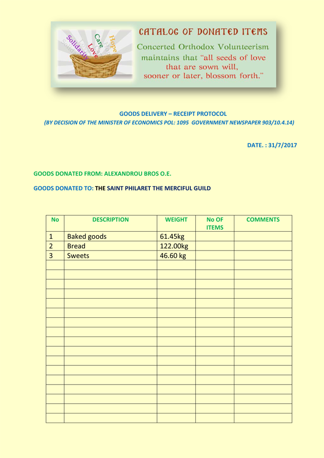 Donation of various goods from Alexander Bros Bakery O.E., 31-7-2017